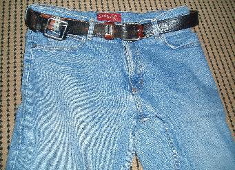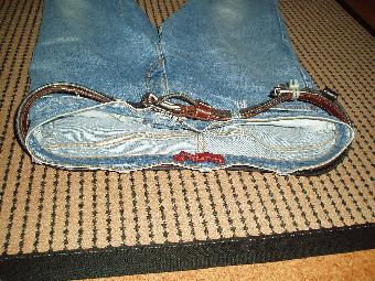Jetzt musste ich eine geeignete Hose finden, weil meine eigenen Hosen im Hosenbund zu end sind, musste ich eine andere finden. Bei den Hosen meines Vaters wurde ich fündig. Nun begann die Suche nach einem geeigneten Gürtel, leider fand ich keinen. Deshalb nahm ich zwei Gürtel und fädelte Sie gegenläufig ein und fixierte sie mit Kabelbinder.